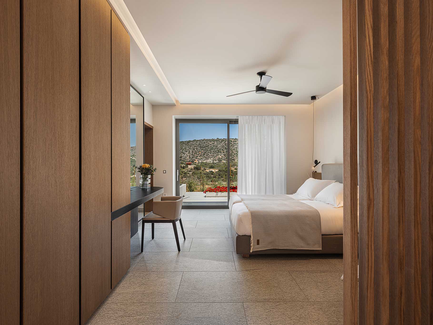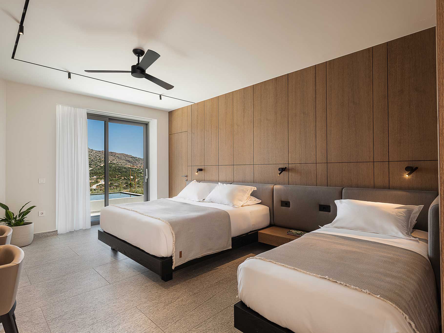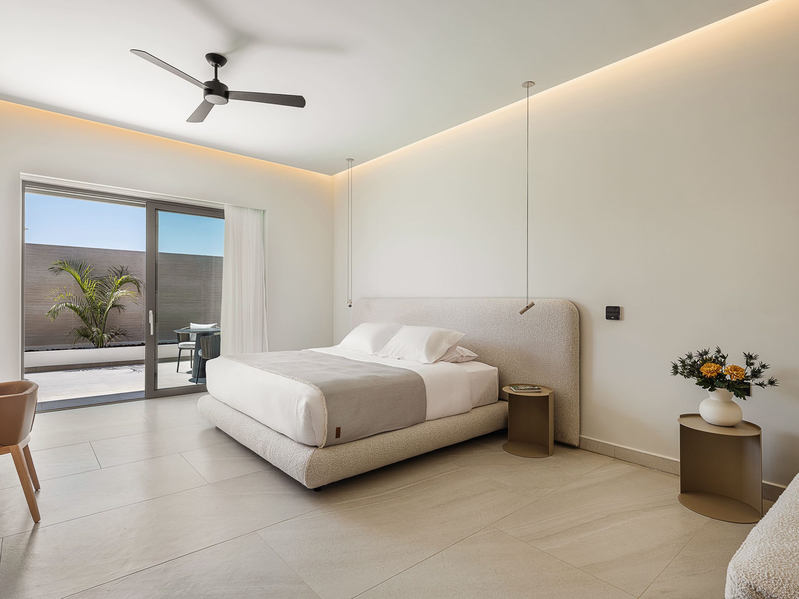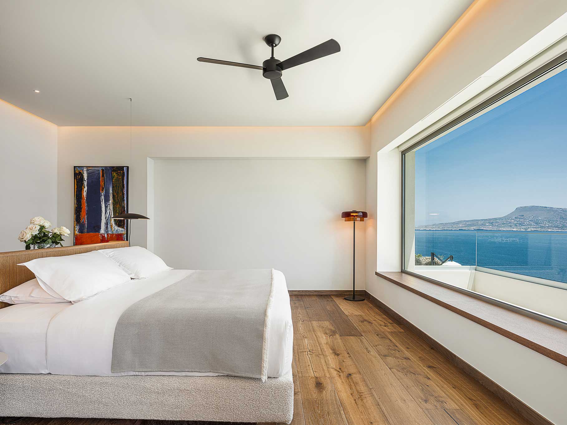 Six suites of sculpted tranquility for up to 14 guests, with sea views, private terraces, and flexible interconnecting layouts – all designed for effortless comfort and privacy.
